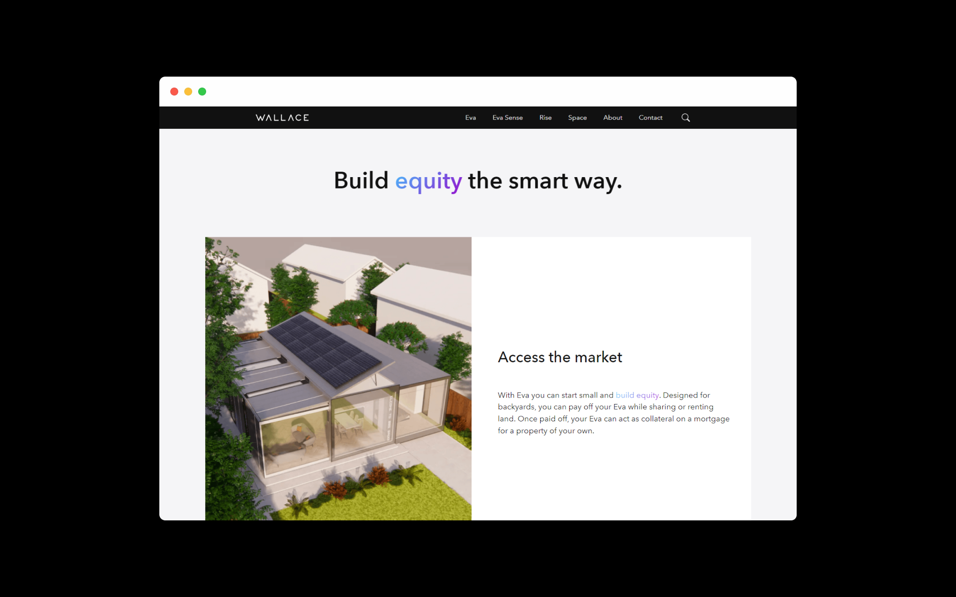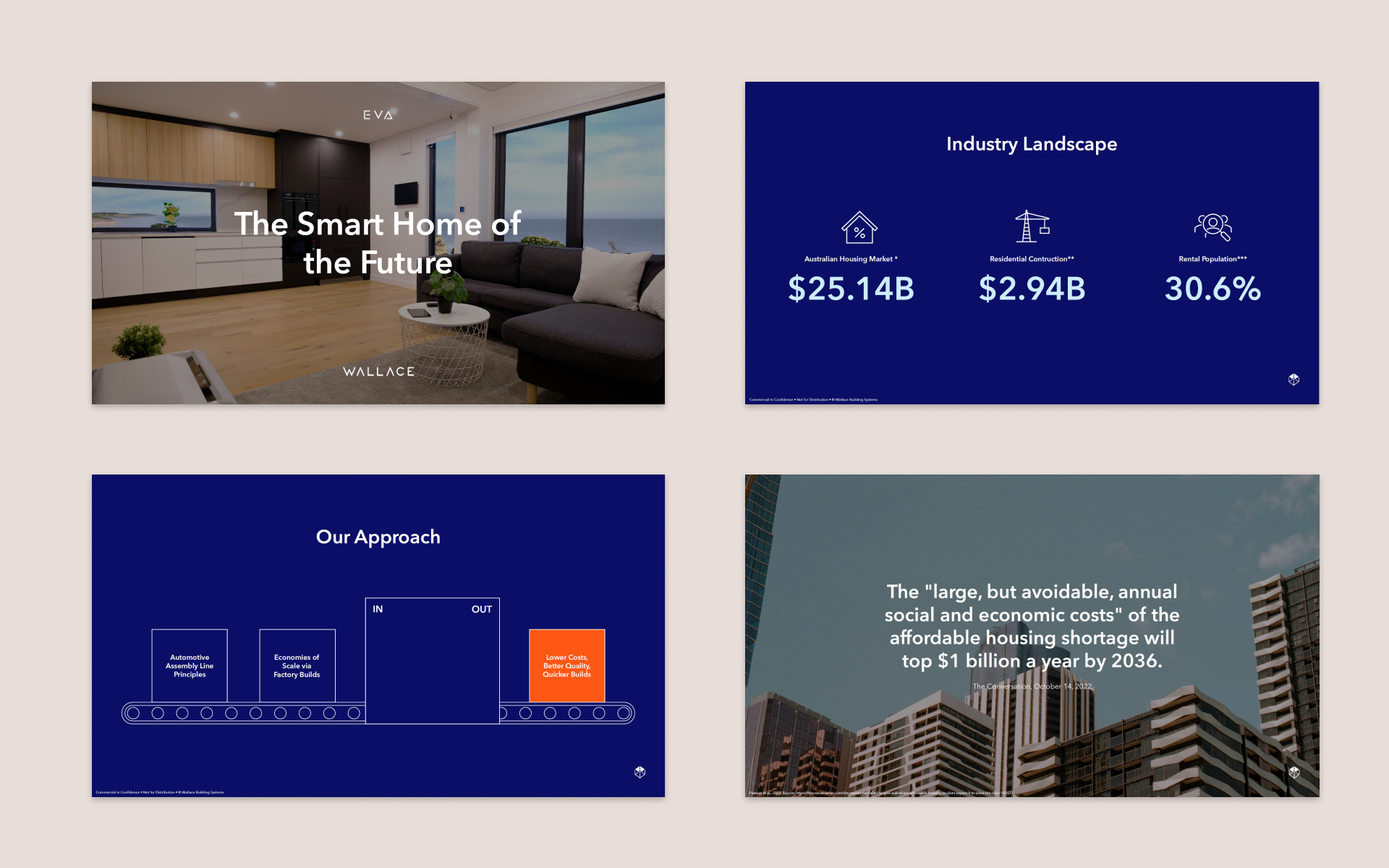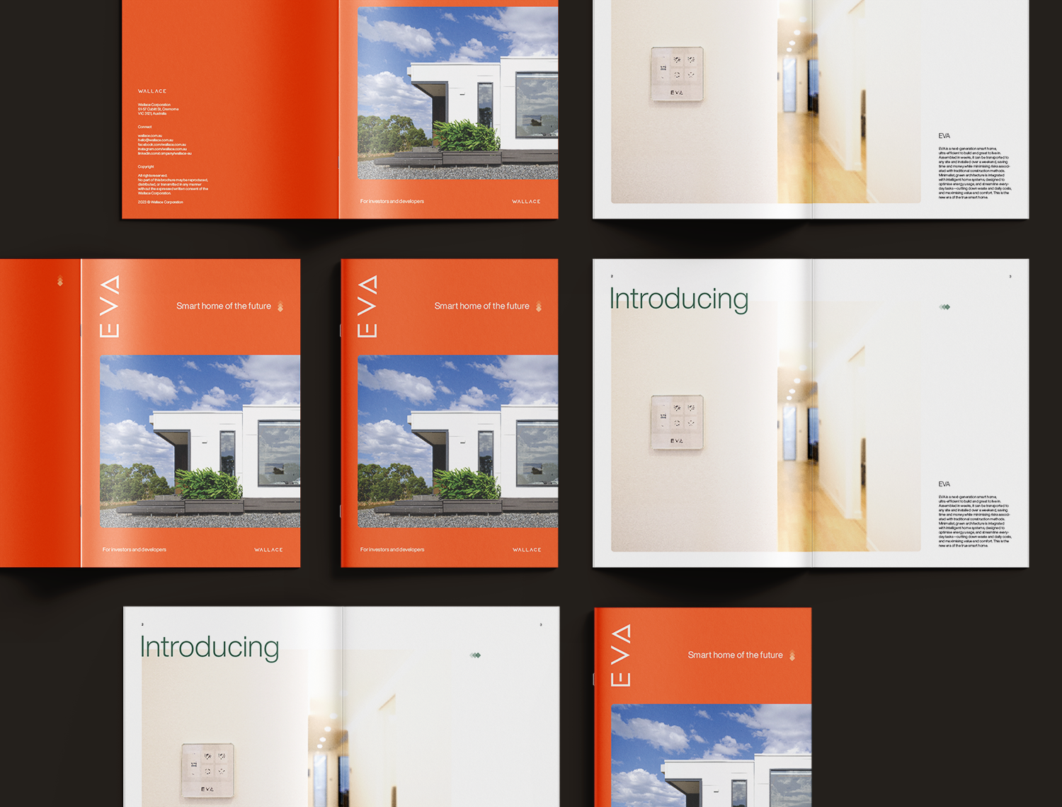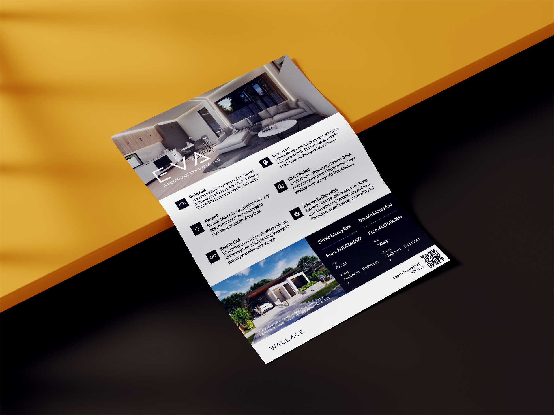 Wallace’s flagship product, Eva, is a cutting-edge smart home that looks after its occupants. Over the course of two years, as Eva went through R&D, we created a variety of print and digital collateral (sales brochures, business cards, flyers, landing pages, EDMs), and designed the broader Wallace website, to support early marketing efforts—towards the client’s aim of selling Evas to investors and real estate developers. In 2023, we designed a product brochure and investor pitch deck that helped to secure EOIs with the government, and a multi-million dollar deal with an Australian aged-care developer.